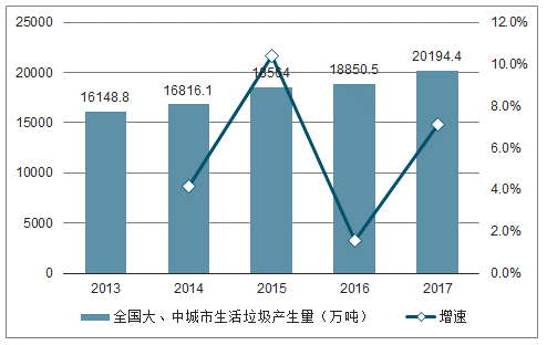 2013-2017年全國(guó)大、中城市生活垃圾產(chǎn)生量統(tǒng)計(jì)及增速