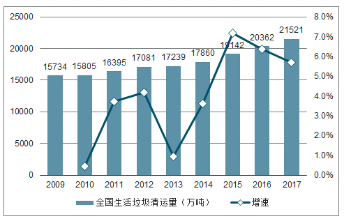 2009-2017年全國(guó)生活垃圾清運(yùn)量統(tǒng)計(jì)及增速