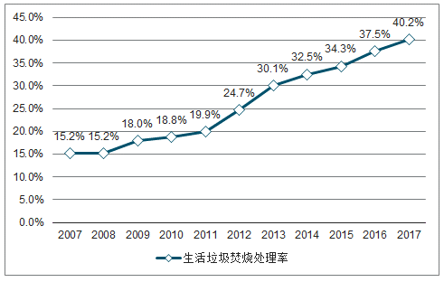 2005-2017年中國(guó)城市生活垃圾焚燒處理率